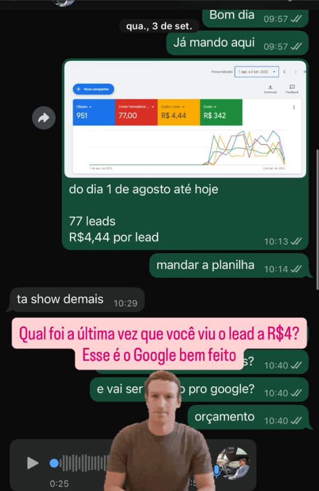 Sua experiência comprovada em entregar leads a R$4,44 no Google e fechar 7 vendas por mês para clientes assegura que você terá o suporte especializado e a gestão de campanha necessária para que a jornada de captação de clientes seja previsível e de sucesso.